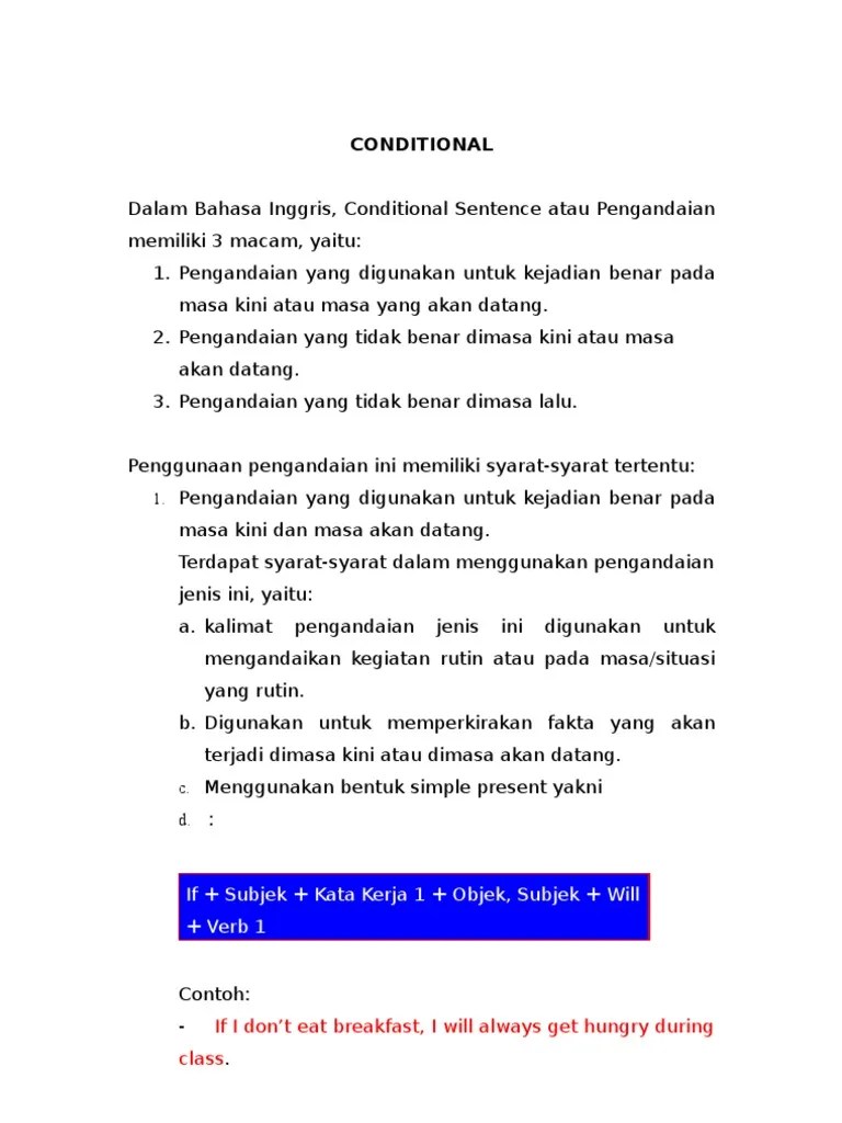 Dalam bahasa inggris dikenal istilah conditional sentence atau kalimat pengandaian. Demikanlah pejelasan yang bisa di sampaikan, semoga dapat menambah wawasan yang bermanfaat baik untuk mengasah kemampuan bahasa inggris anda . Di antara fungsi kalimat pengandaian dalam bahasa inggris tersebut adalah: Pengandaian tersebut di dalam bahasa inggris dipakai dalam kalimat if clause. Contoh kalimat if/whether pada indirect question. 1, he asked me if i had a little time. Serta penggunaan if dan whether dalam kalimat bahasa inggris. Kecuali untuk penggunaan subjek orang pertama atau kedua tunggal (i, . Dalam bahasa inggris dikenal istilah conditional sentence atau kalimat. Ciri utama conditional sentence adalah adanya penggunaan "if" didalamnya, . Conditional sentence adalah bentuk kalimat dalam bahasa inggris yang digunakan untuk menyatakan pengandaian, keinginan, atau bahkan kemungkinan. Memahami expression of pain, relief, dan pleasure . Kalimat pengandaian adalah suatu kalimat yang dimaksudkan untuk .
